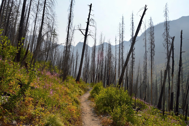 Our hike involved a bit more elevation gain this day, but not much as far as views. As you can see below, it was very smoky and the trees were either dead/burnt from wildfires, or very young and small (growing after a fire). This made the hike very bright and hot.